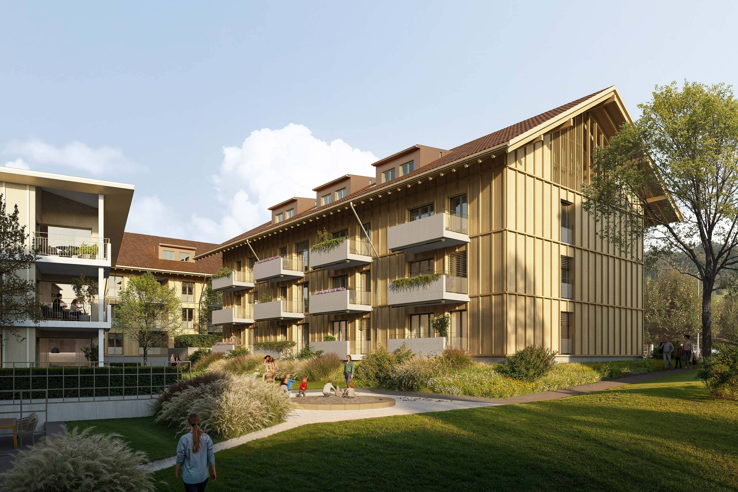 Die 24 Wohnungen und die 2 Wohnateliers/Lofts in den Gebäuden D und E kombinieren natürliche Eleganz und moderne Architektur. Schattendächer, klassische Ziegelverkleidung und markante Fichtenschalung verleihen diesem Gebäudetyp eine warme Ausstrahlung. Dunkelgraue Staketengeländer und Balkone aus Beton setzen Akzente, während olivegrüne Markisen den Aussenbereich harmonisch abrunden.